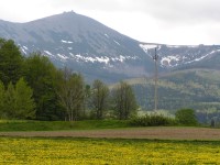 Auf der Weiterfahrt haben wir einen schönen Blick zur Schneekoppe über leuchtende Löwenzahnwiesen.