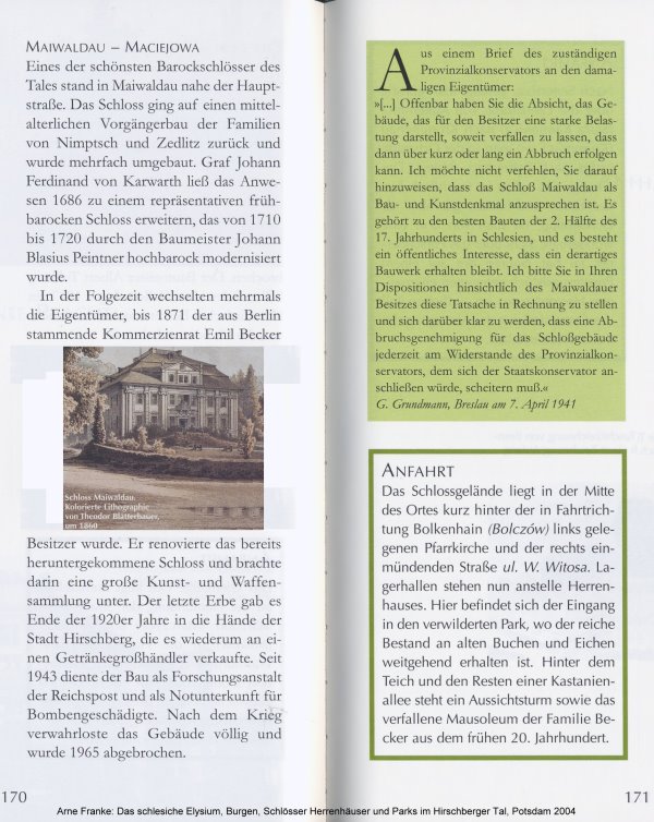 Am Abend versucht Gaby, Reste des Schlosses Maiwaldau der Grafen Karwath zu finden. Das große Barockschloss wurde in den 60ere Jahren nach starkem Verfall abgerissen. Es gibt keine sichtbaren Erinnerungen mehr. (Mehr über "Das Wappen Karwath")