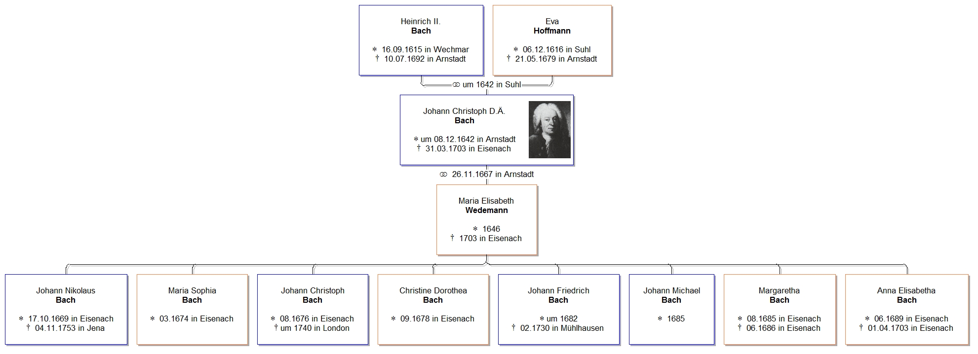 Er war seit 1665 Organist an der Georgenkirche in Eisenach und zugleich Cembalist an der Hofkapelle; gilt als bedeutenster Komponist der Bachfamilie vor der Zeit von Johann Sebastian Bach. Von ihm sind Kantaten, fünf- und achtstimmige Motetten , 44 Choralvorspiele für Orgel erhalten geblieben. (Quelle: Brockhaus 19.Auflage)