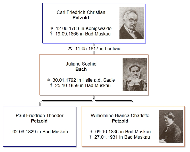<Historie> Aus der 1. Ehe mit Christiane Roesner ging der Gartenbaumeister Carl Eduard Adolph Petzold hervor. Aus der 2. Ehe mit Juliane Bach entstammte die jüngste Stief-Schwester von Carl E.A. Petzold, die Wilhelmine Bianca Carlotte, die in die Fähndrichsippe nach Fürstenwalde einheiratete.