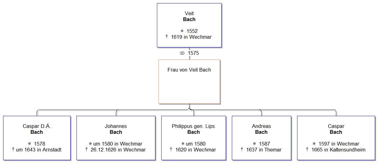 Vitus Bach, ein Weißbäcker aus Ungarn, verließ Ungarn im 16 Jahrhundert wegen seines lutherischen Glaubens. In Wechmar nahe Gotha hat er sich als Bäcker und Müller niedergelassen. Es ist unklar wo er geboren ist. Wenn er eingewandert wäre, muß er in kurzer Zeit ein beträchtliches Vermögen erwirtschaftet habe, das es ihm ermöglichte in Wechmar eine Mühle zu kaufen. Es wird eher davon ausgegangen, daß die Familie längere Zeit in Ungarn gelebt hat und aufgrund der Religionszugehörigkeit Ungarn verlassen mußten.