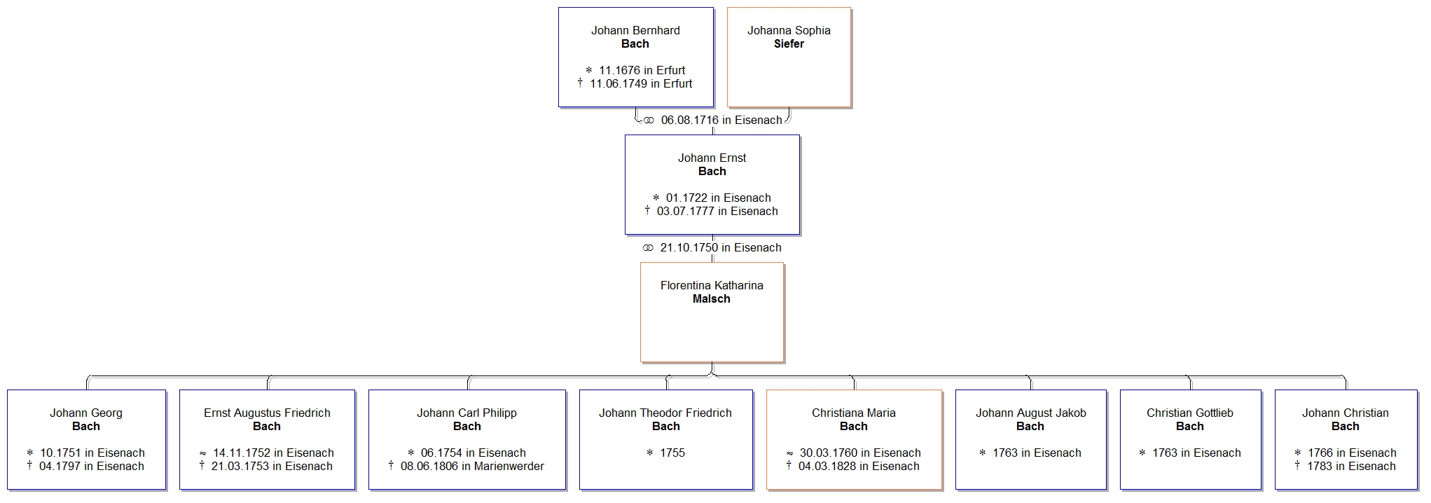 Schüler von Joh.Seb. Bach, ab 1737 Student der Rechte in Leipzig, 1748 offizieller Adjunkt seines Vaters an der Georgenkirche in Eisenach, wurde ein Jahr später dessen Nachfolger als Hof- und Stadtorganist, wirkt zudem ab 1741 als Amtsadvokat. 1756-1758 war er Leiter der "Hochfürstlichen Capelle" in Weimar, war zugleich in Eisenach in der herzoglichen Finanzverwaltung tätig, ab 1765 Kastenverwalter der Kirche. ( aus Stammbaum der Bache, Peter von Bartkowski Edition, Hamburg)