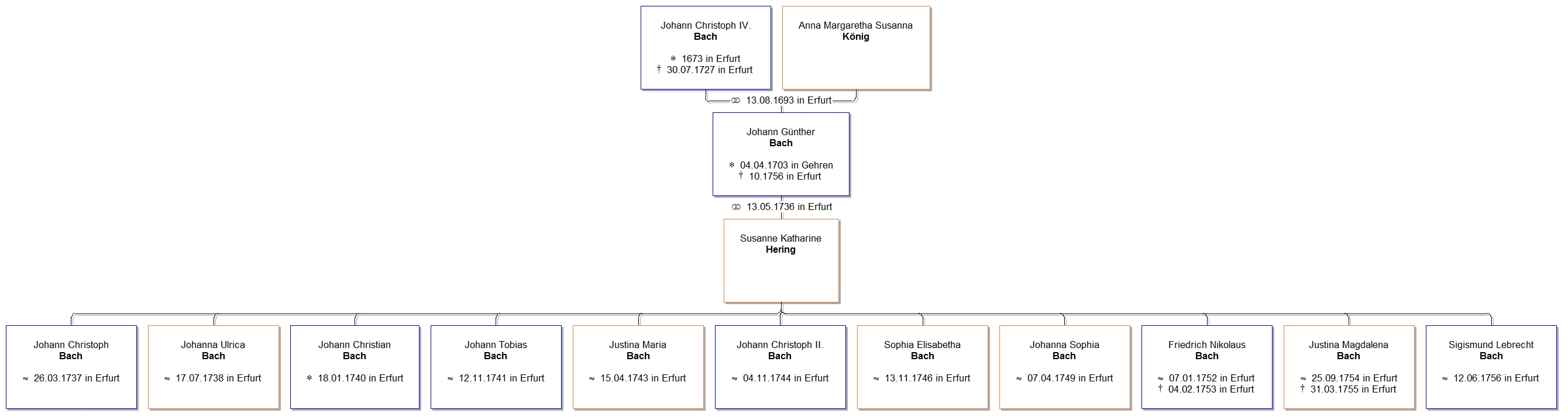 Gehörte als Tenorist und Violist der Ratsmuski in Erfurt an, amtierte dort seit 1735 zudem als Schullehrer. ( aus Stammbaum der Bache, Peter von Bartkowski Edition, Hamburg)